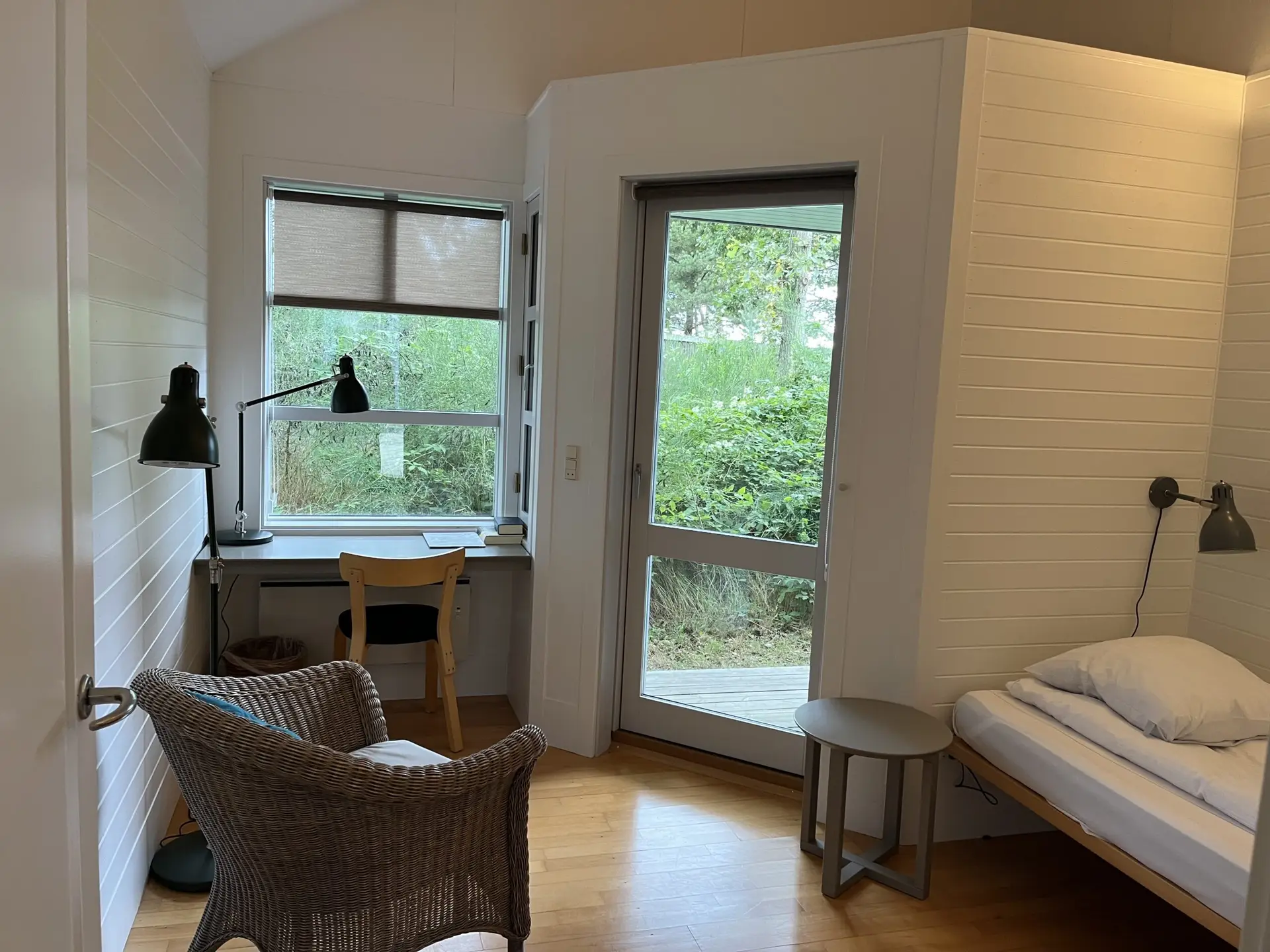 Vi indkvarteres alle i enkeltværelser med eget bad og toilet. Værelserne er lyse, enkelt indrettet, har udsigt til naturen og egen indgang via overdækket gangareal. Hvert værelse har mindre terrasse med en kurvestol.